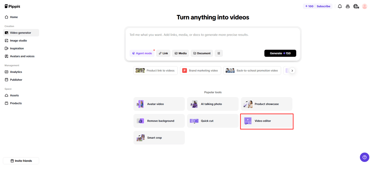 Log into Pippit, then navigate to the “Video generator.” Select “Video editor” to unlock the workspace where lyric design starts. This space gives you everything you need to style, format, and animate your lyrics alongside the music.
